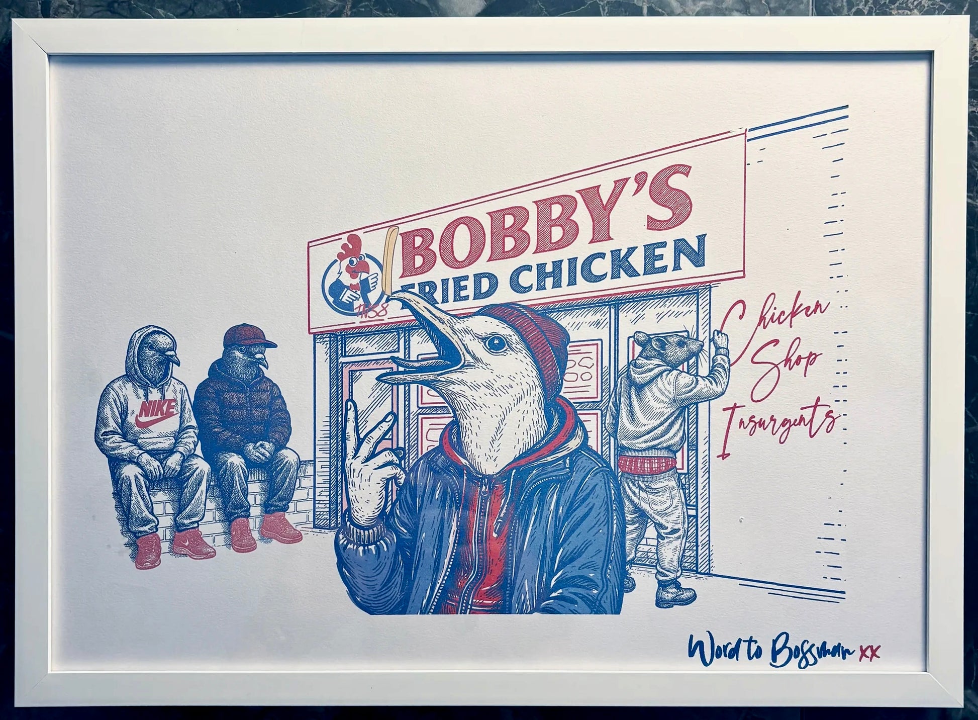 Word to Bossman brings street culture to life with Chicken Shop Insurgents, a two-colour illustration that blends gritty realism with surreal humour. Outside Bobby’s Fried Chicken, a crew of pigeons and a seagull frontman post up in full Nike and North Face drip, while a rat tags the wall. It’s a slice of late-night takeaway culture turned insurgency, where the animals run the block.
