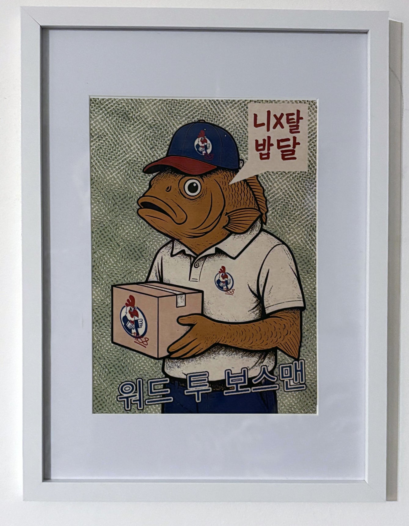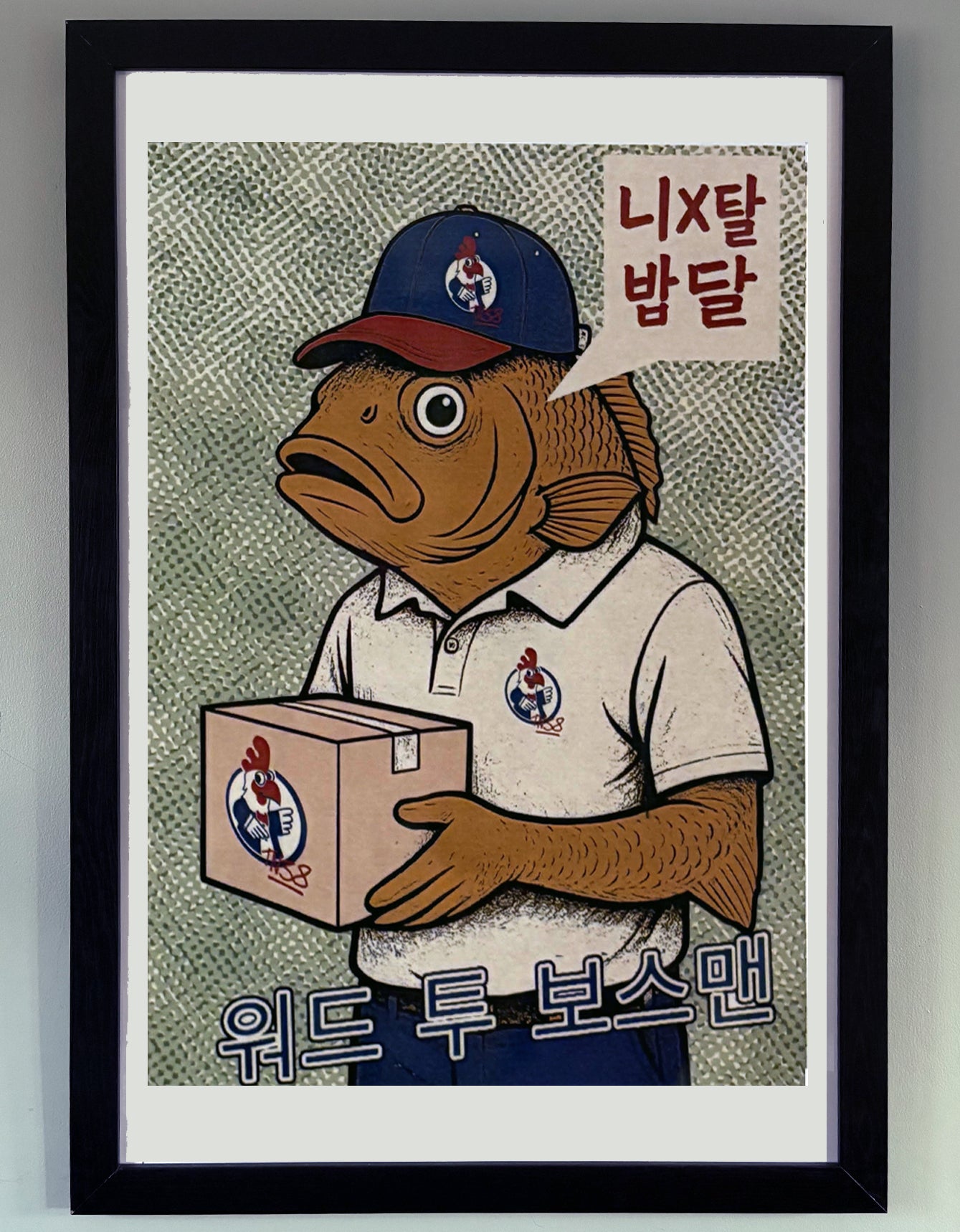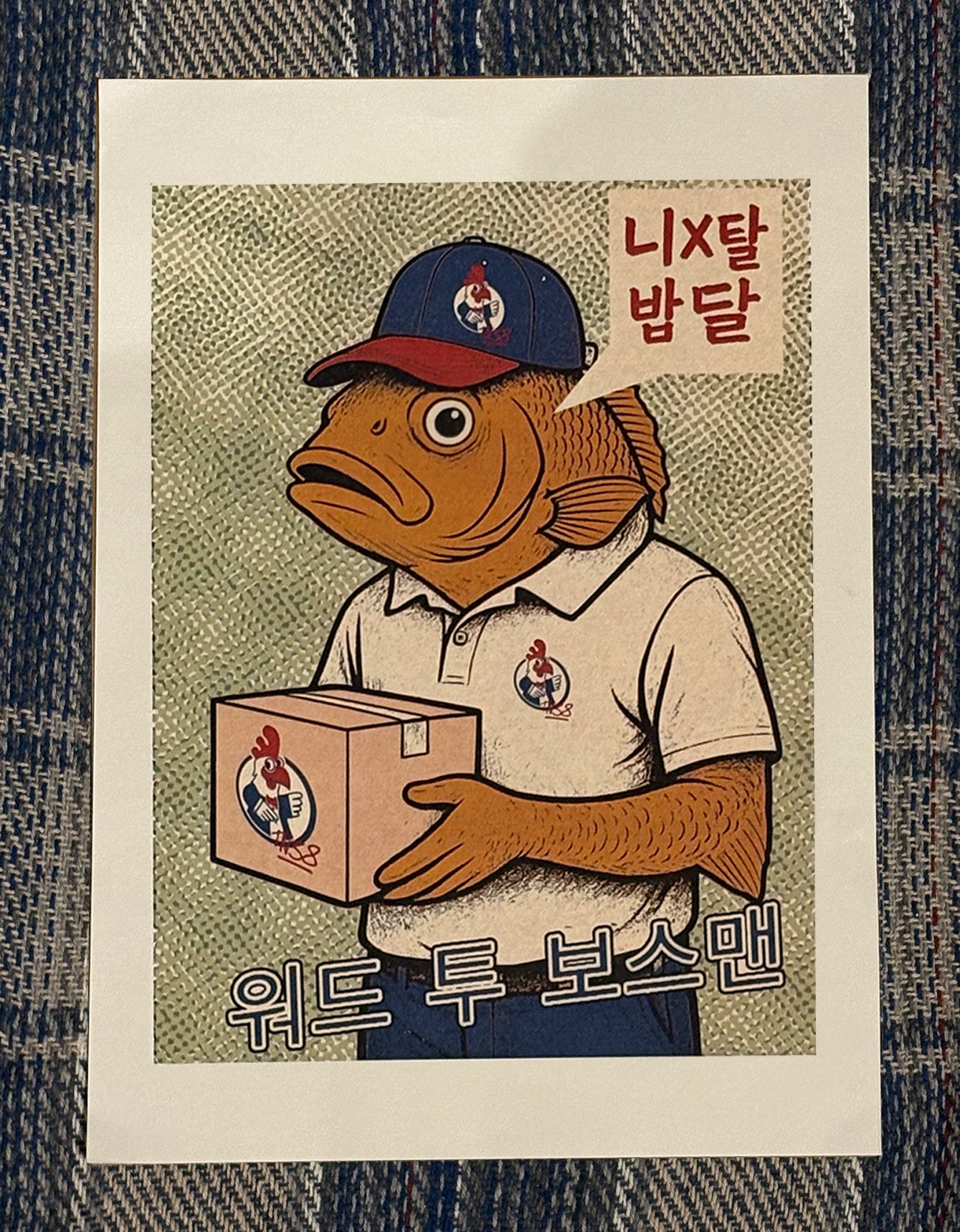 With bold illustration and a playful nod to both fast food culture and fishy myth, this piece is equal parts absurd and brilliant. Do not ask me what it says, I do not speak Korean either.