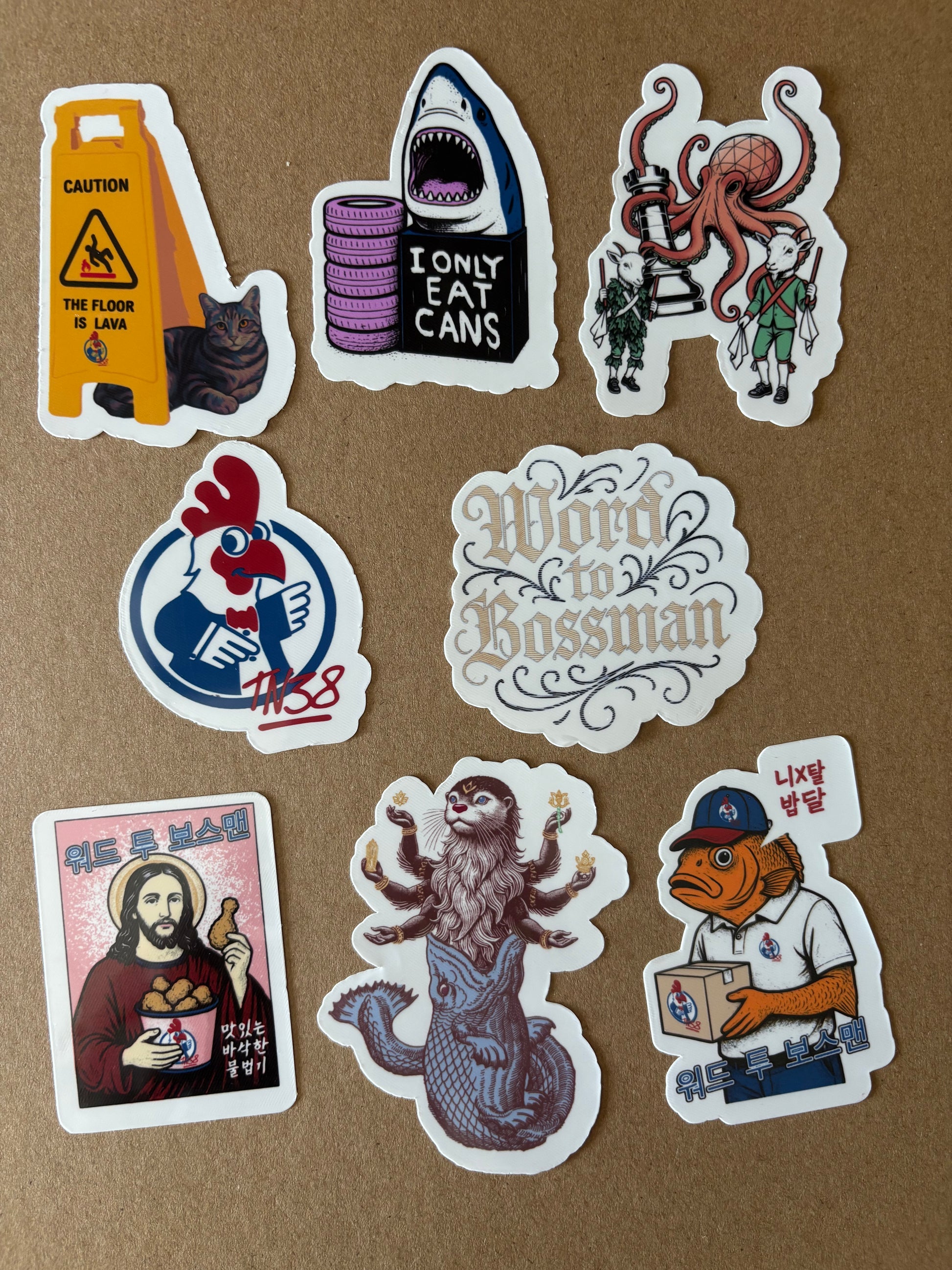 A full set of 8 waterproof vinyl stickers featuring Word to Bossman designs. Same set every time, no duplicates, no lucky dip nonsense. Printed on tough vinyl that shrugs off rain, sunlight, and the odd spilled pint. Perfect for laptops, bottles, sketchbooks, or slapping up somewhere dodgy.