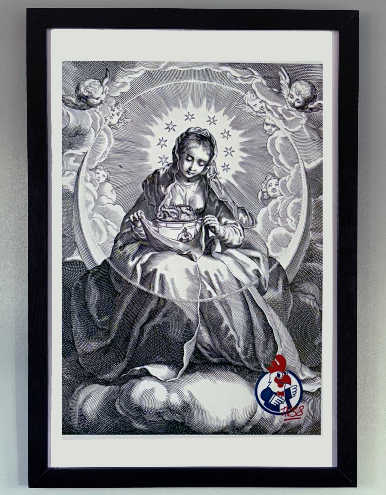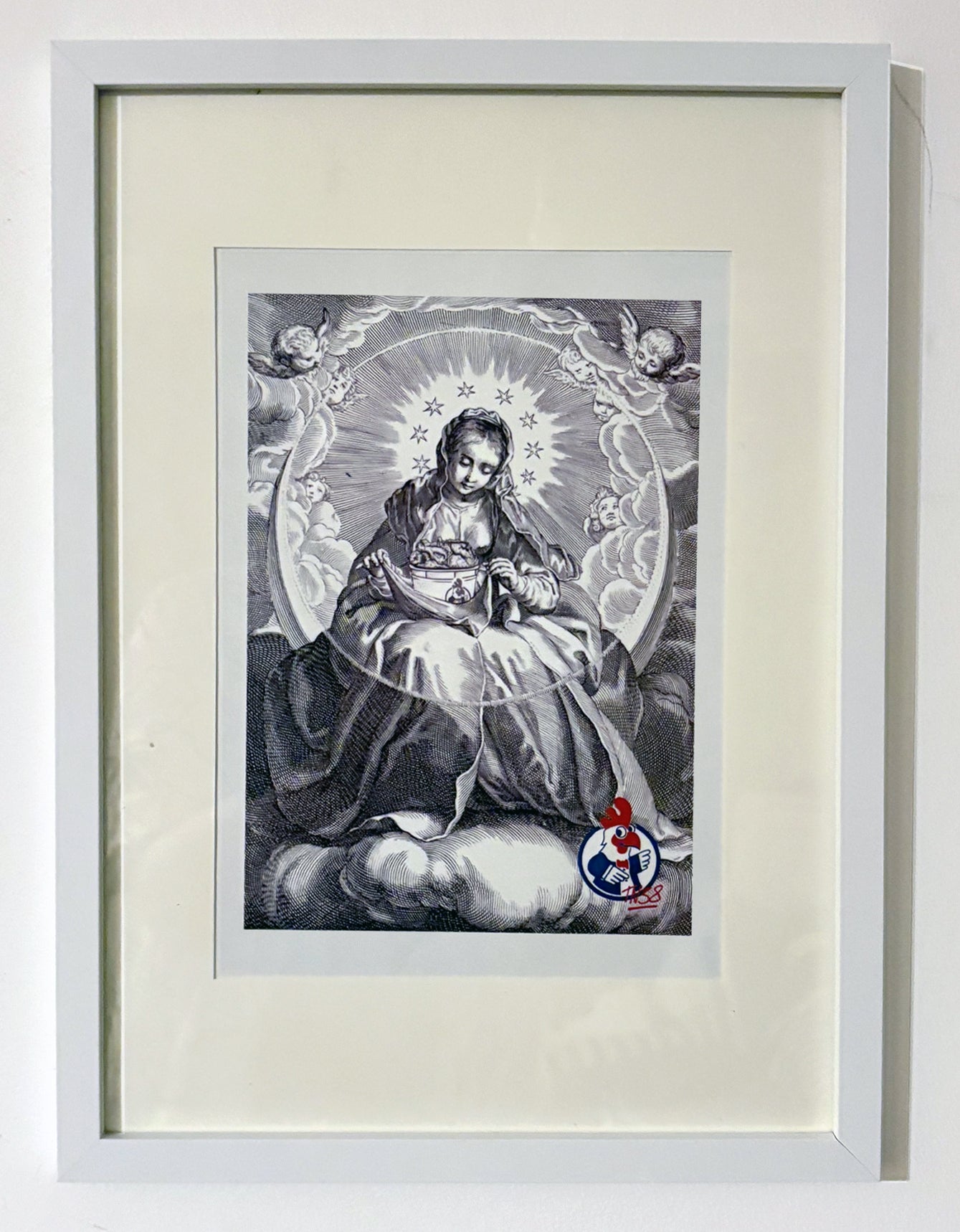 The original image is based on traditional religious engravings of the Virgin on the crescent moon surrounded by stars. It is a timeless image that has been given a playful edge. Reverent, absurd, and brilliant all at once, this piece is perfect for anyone who likes their walls to make people look twice.
