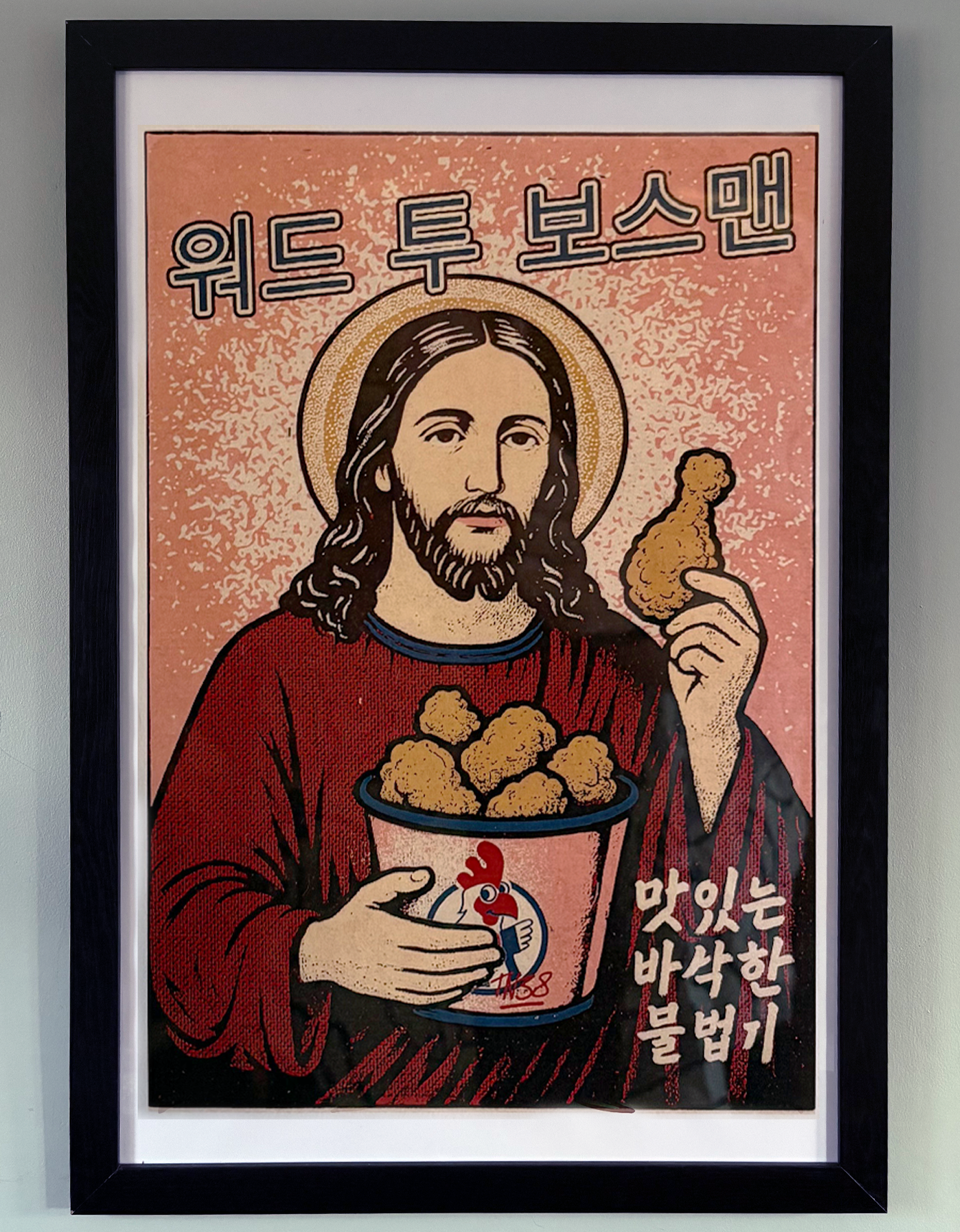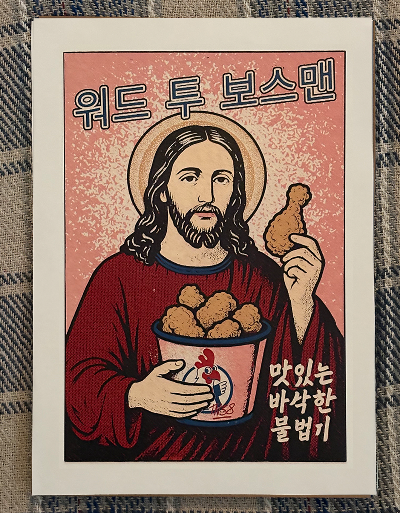 Printed with care and a wink, this piece is all about mixing fun with iconic imagery and just a little bit of chicken shop. Ideal for your lounge, bedroom, studio, or anywhere you need the comfort of knowing Jesus has got your back in a very large way.