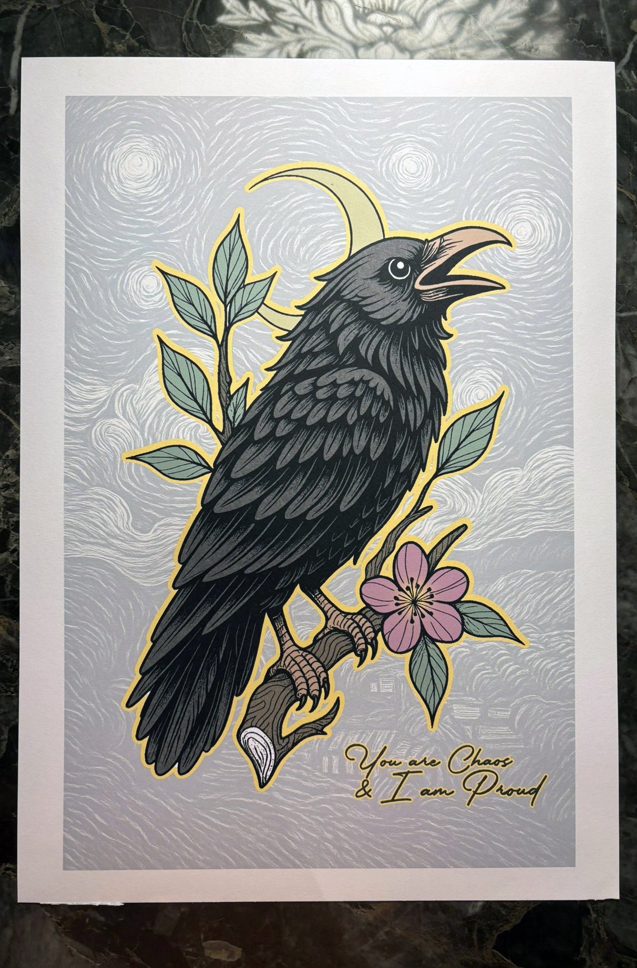 Set against a swirling sky that nods to classic woodcut textures and van Gogh-esque turbulence, Bernard’s black plumage is outlined in a soft gold glow that gives him an almost saintly aura. The blossom at his feet hints at softness. The talons say otherwise.